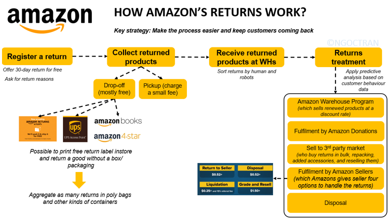 What Amazon has done first was to gain the insight of that almost 80% of customers wanted free returns. Then, they introduced a 30-free-day return policy and simultaneously, asked for the reason (e.g. wrong size/color, damage, changed mind, etc.). This not only helps them identify the bottlenecks, but also separate customers who seem to abuse the return policy. Next, they offer customers two options for returning the items: drop-off and pickup. Usually, customers will be charged if someone goes to their home and picks the returns, because those pickup men account for a majority of cost and inefficiency. Instead, it is free if customers bring the returns to a drop-off point, which is nowadays easily accessible thanks to multiple locations across the neighbourhood or city. That is why Amazon and other e-commerce companies have established partnership with supermarkets and shopping malls to make it easier for customers. This also creates a win-win situation where customers, after getting the refund (soon), tend to wander around the stores and get something nice. Furthermore, if the value of the return exceeds the return costs, the customer may just keep it and wait for the refund. The following step is to sort the returns by robots and human after they reached the warehouses. As shown in figure 2, Amazon has five options to handle the returns, which reflect their intention to stimulate sustainability as much as possible. These methods depend on Amazon sellers and customer behaviour data. For example, Amazon sellers can choose the returns to be donated, or customers can deliver the returns without the packet so that Amazon can cut down the individual packaging waste.